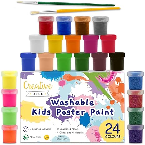 Creative Deco Temperas Pintura Lavable De Dedos Niños Bebes 24 X 20 Ml Copas No Toxica Colores Básicos Fluorescentes Brillantes Metálicos Y